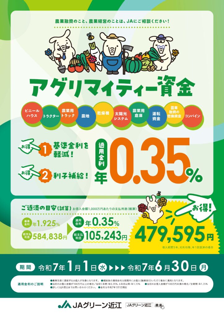 低金利の農業事業者向けの融資を活用して販売価格・販売量を上げて売上増加のためには、融資も投資と考えよう。補助金もあれば、有効活用しよう!(但し、補助金ありきにならないように!)令和7年7月22日(火)まで滋賀県未来投資総合補助金があるので提案します(株)木俣商会でもサポートしますので遠慮なくご相談下さい。詳しくは、各金融機関窓口および国県市町の行政にご相談ください。