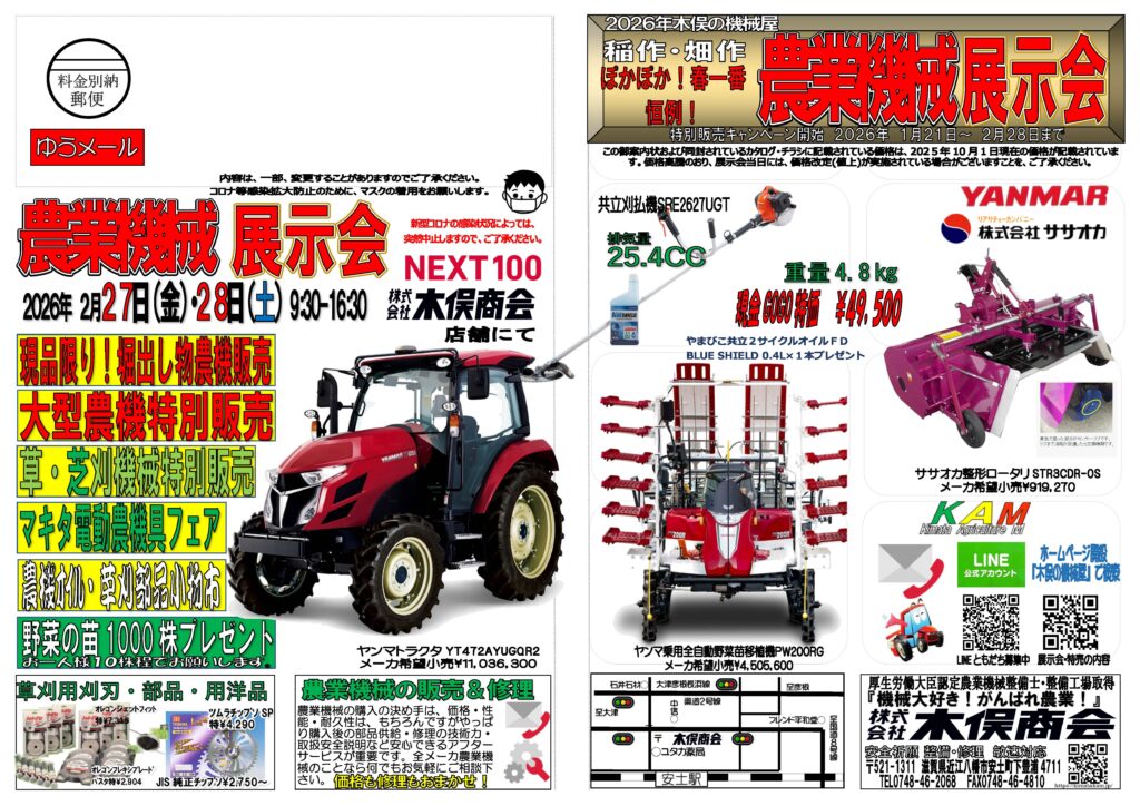 画像をクリックすると25060602-01豊作祈願!恒例!夏の!機械屋展示会A3新ゆうメール展示会DMに同封の各々のカタログご覧いただけます。